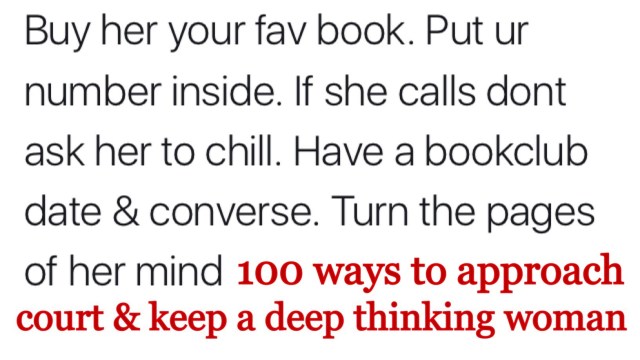 #23. Observe her social media for her passions. Read a book on the topic. DM her ur thoughts. Say “Id love to converse deeper. What’s ur number?”